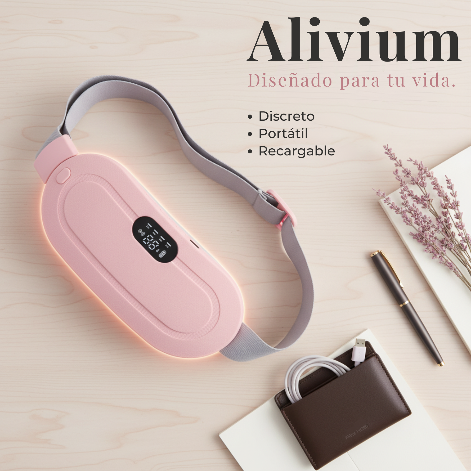 Portabilidad y discreción para tu día a día. Recargable, ligero y silencioso. Lleva contigo a Alivium al trabajo, a una reunión o de viaje. Tu aliado mensual cabe perfectamente en tu bolso.