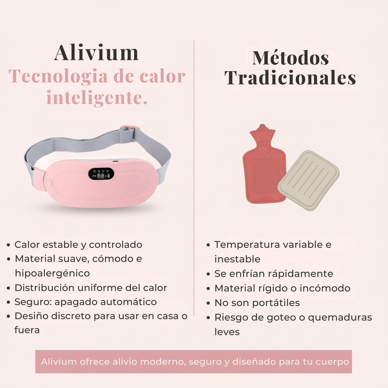 Olvídate de los métodos tradicionales inestables. Alivium ofrece calor estable y controlado sin riesgo de quemaduras o enfriamiento rápido. Es el alivio moderno, seguro y diseñado para tu cuerpo.